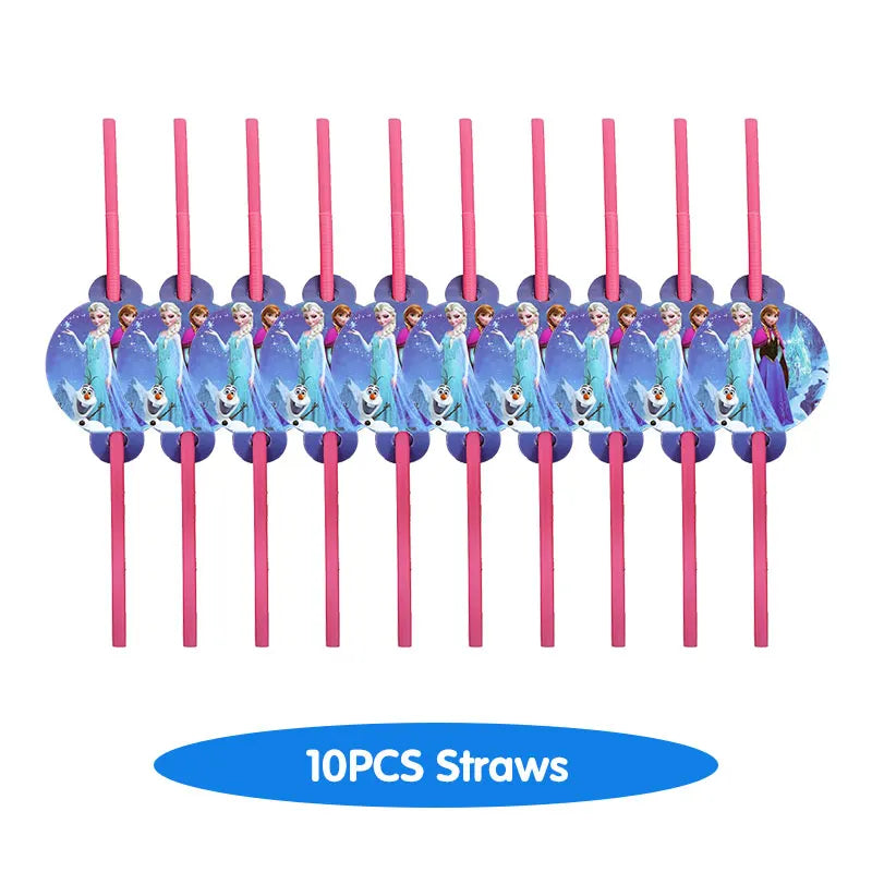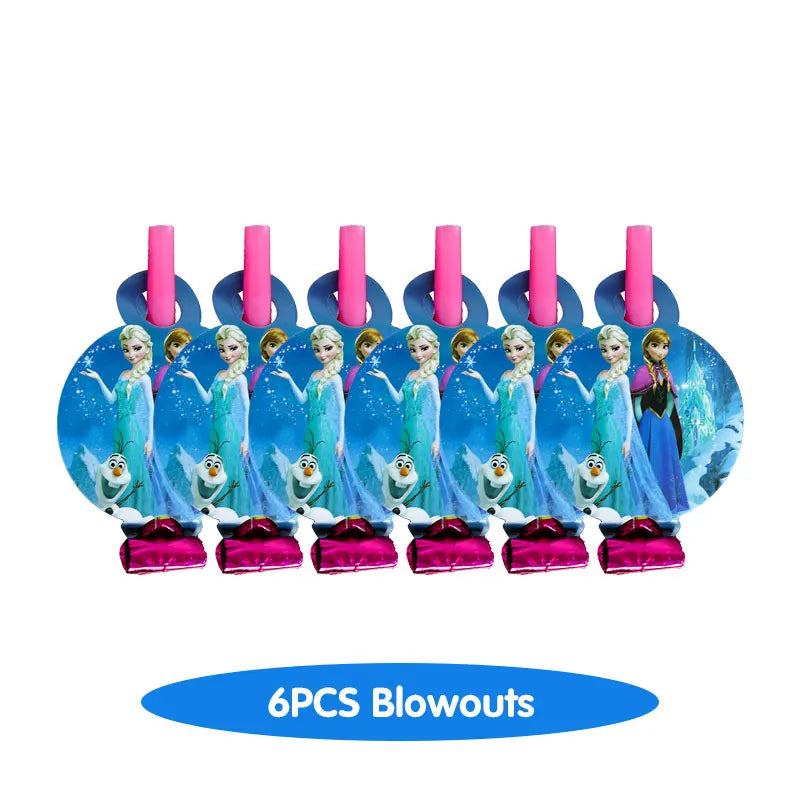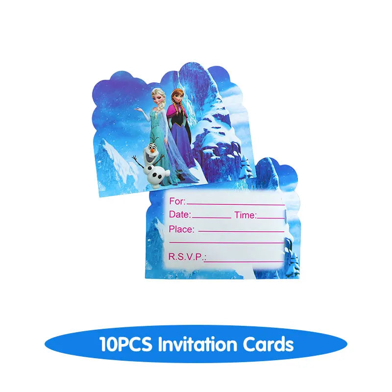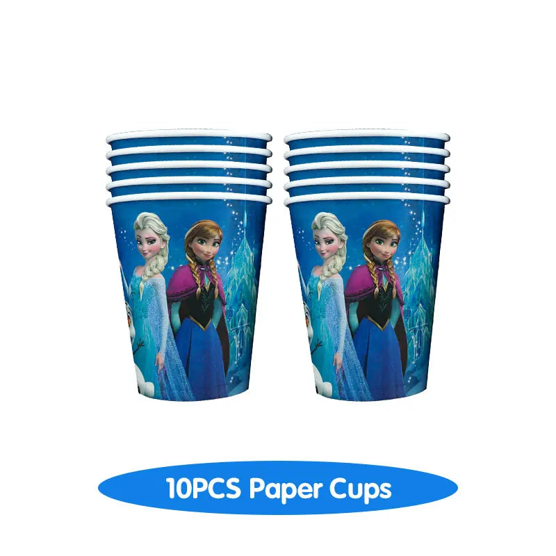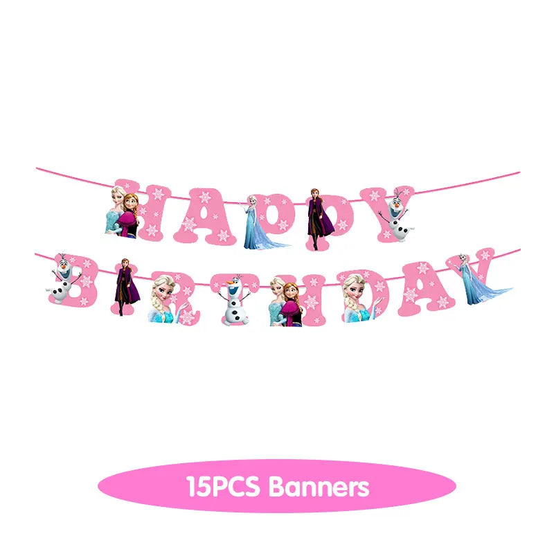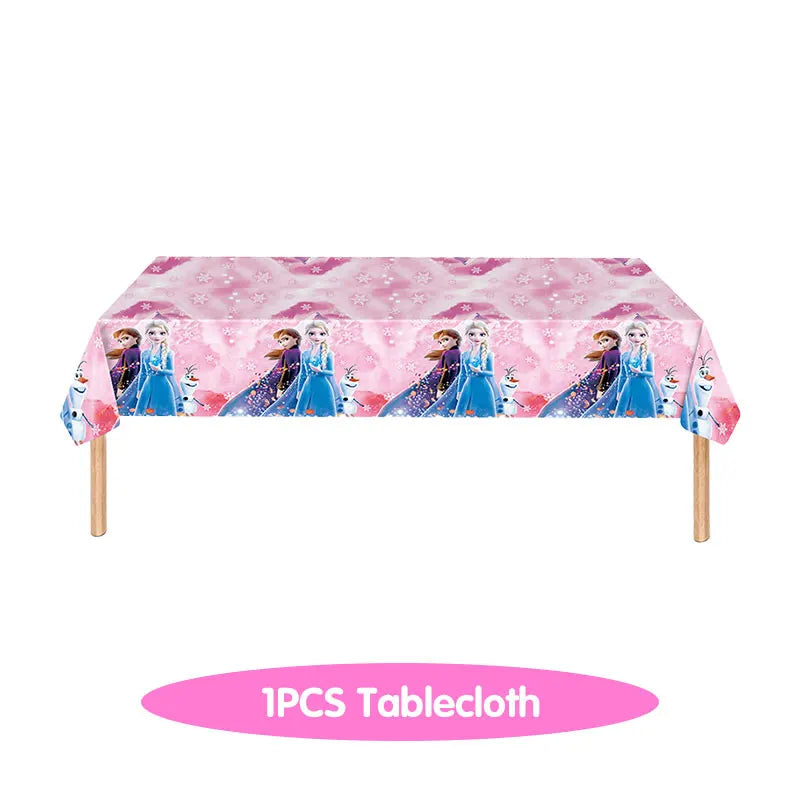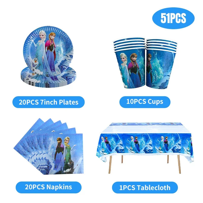 Incluye mantel, globos, platos, vasos y servilletas con los personajes de Frozen, en tonos azul hielo y blanco, para crear una atmósfera encantadora y elegante que encantará a los más pequeños.