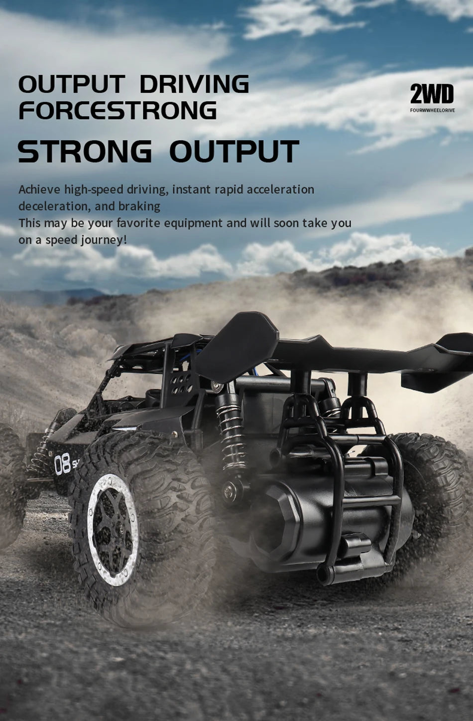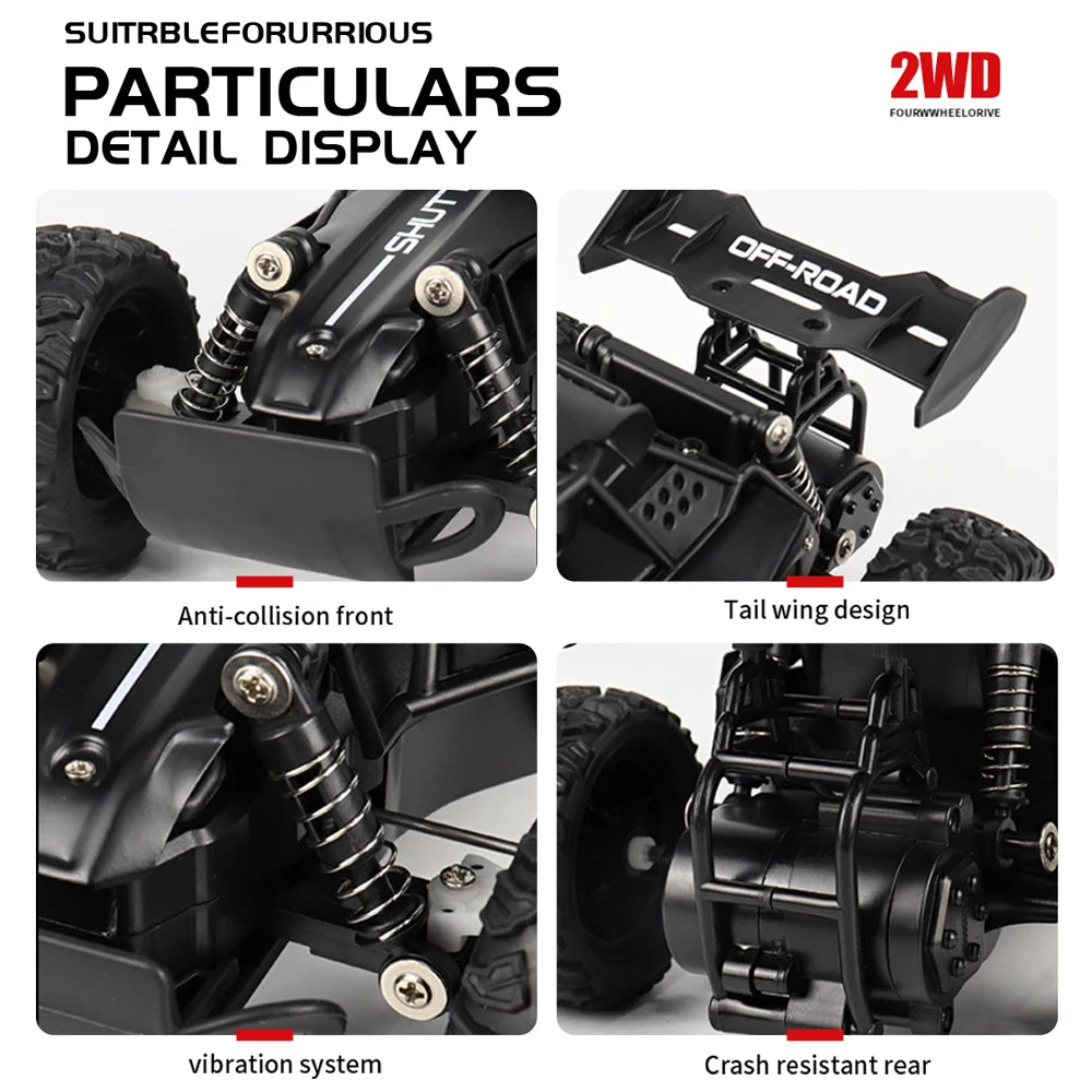 Este coche RC permite a los niños y principiantes experimentar carreras off-road y escaladas en terrenos difíciles. La combinación de tracción 2WD, luces LED y alta velocidad proporciona diversión y aprendizaje, desarrollando habilidades de coordinación y control.