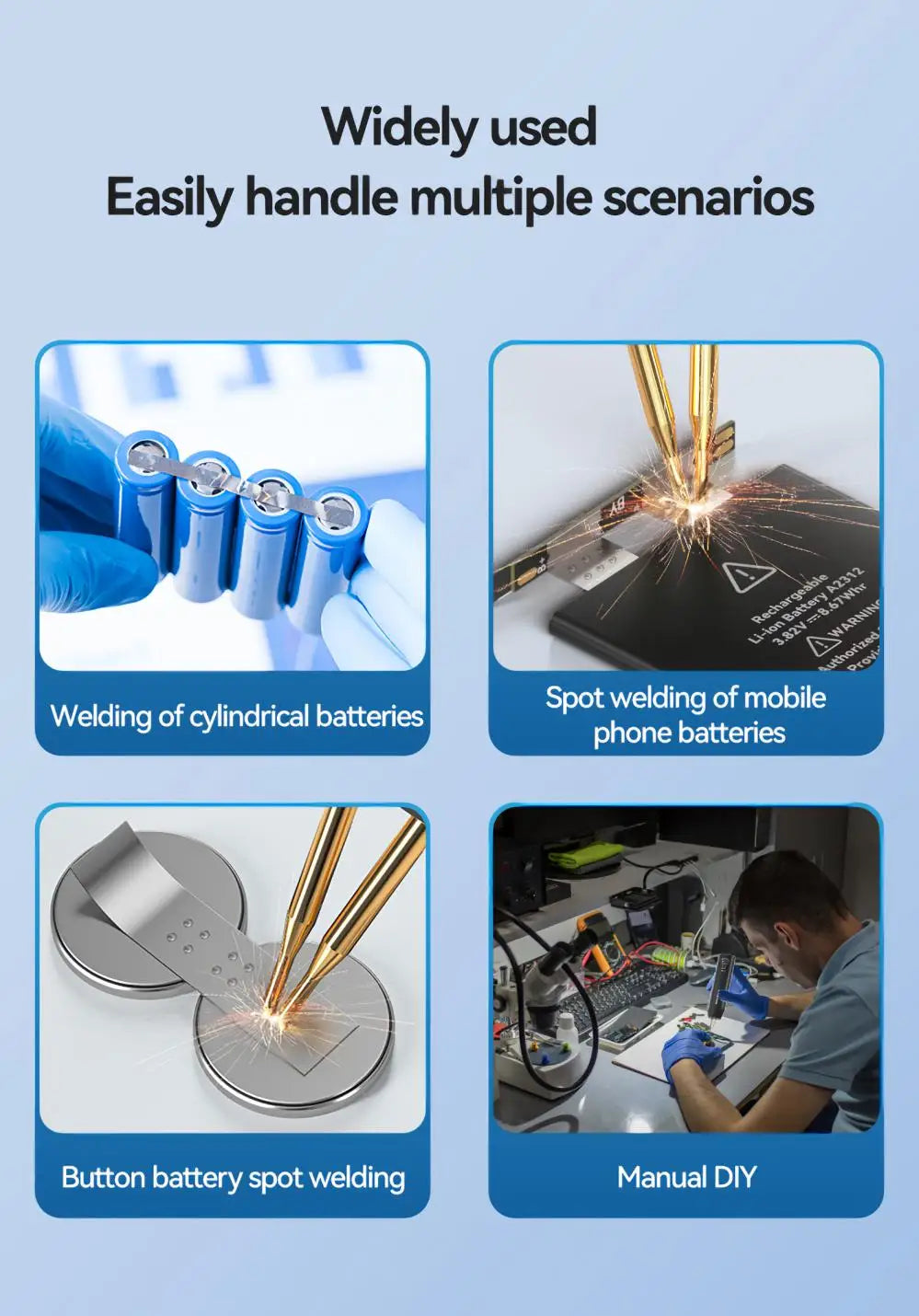 Su diseño portátil y ergonómico lo hace ideal para talleres, aficionados al DIY y profesionales que necesitan una herramienta confiable para unir celdas de batería, asegurando conexiones firmes sin dañar los componentes.